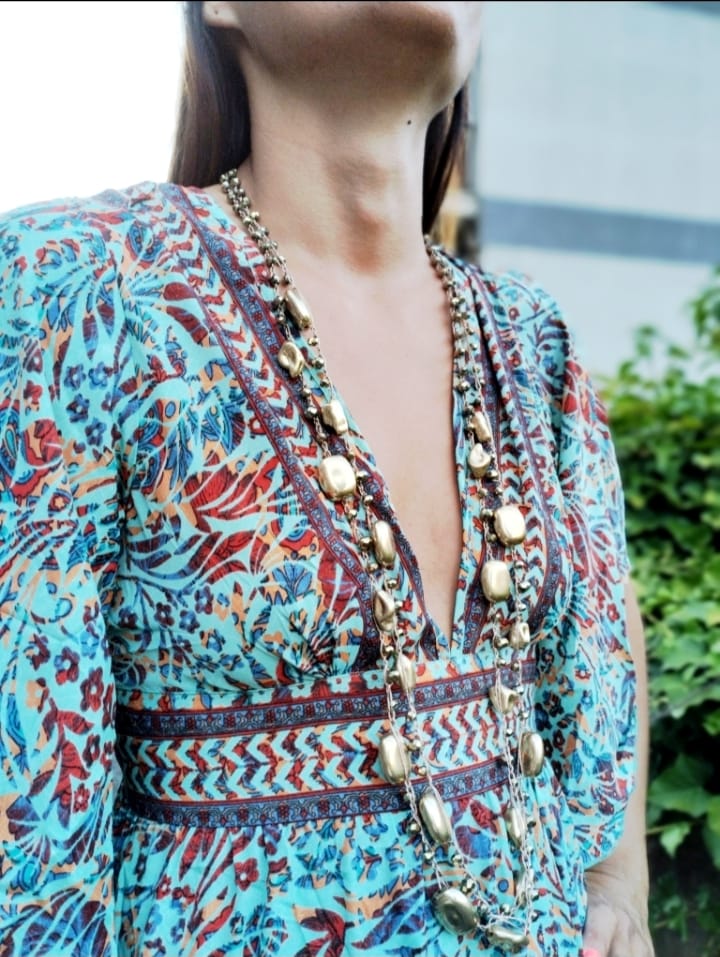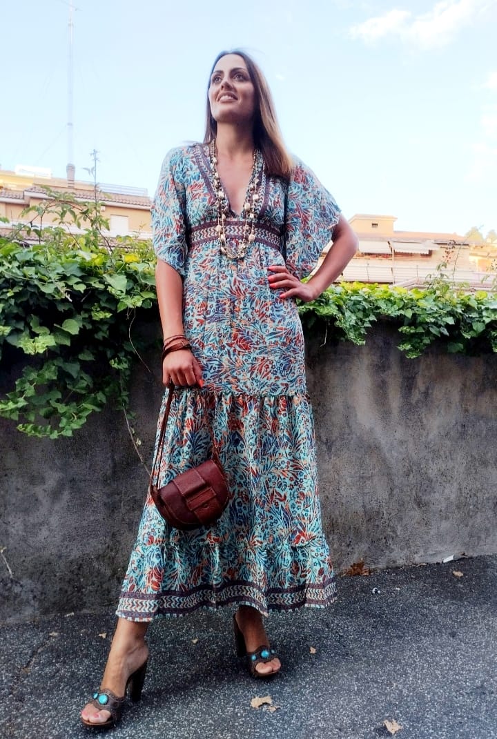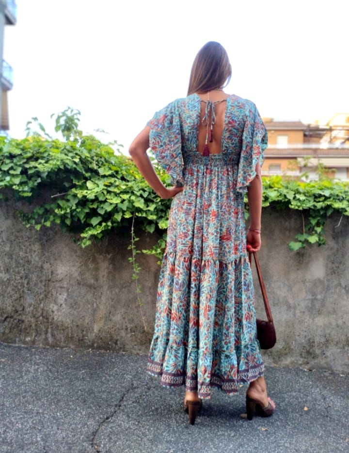 Questo abito con manica cadente e scollo a V unisce uno stile country e originalità dei colori, valorizzando la silhouette con un tocco di femminilità. Offre una vestibilità fluida che accompagna i movimenti con naturalezza, rendendolo una scelta versatile per il tuo guardaroba.