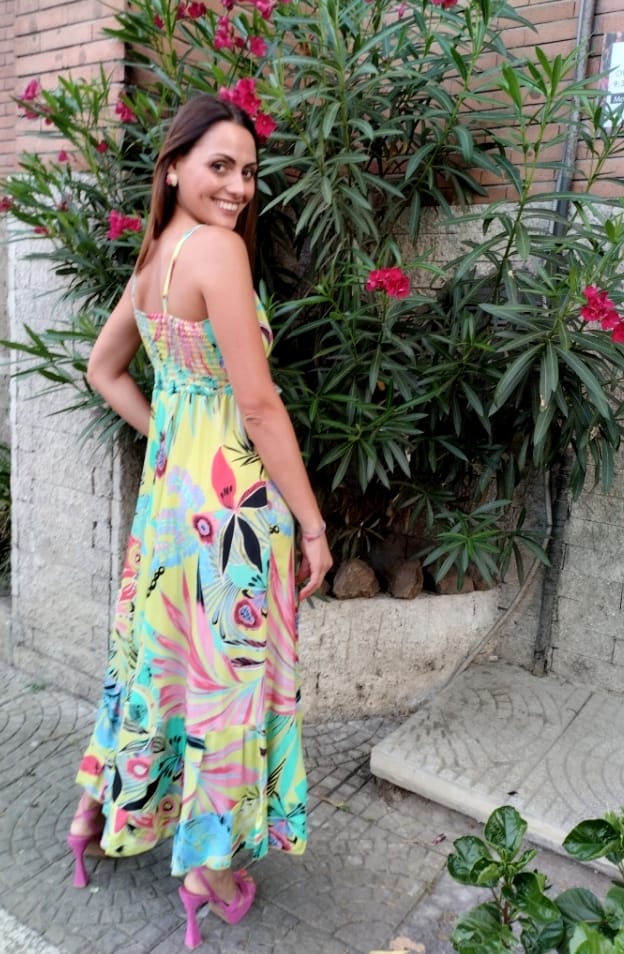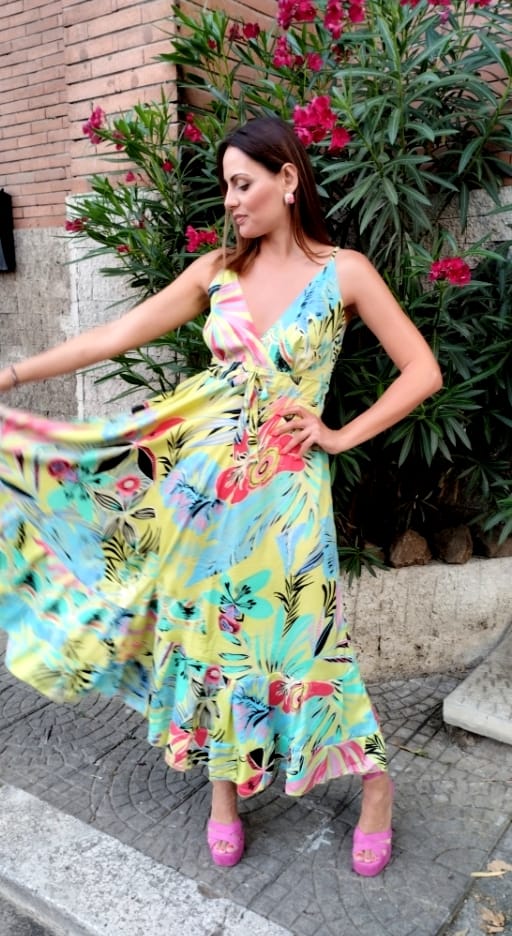 Questo abito con fantasia esotica unisce originalità e stile naturale, perfetto per chi desidera un look particolare e distintivo. Garantisce comfort senza rinunciare alla sofisticatezza.