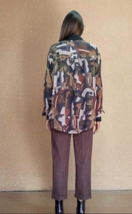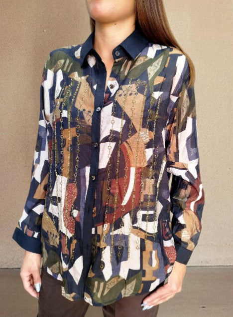 Camicia a fantasia irregolare con strass. Un capo che unisce eleganza e originalità in ogni dettaglio. Perfetta per chi desidera distinguersi con un tocco di glamour, questa camicia valorizza ogni tuo look con la luminosità degli strass.