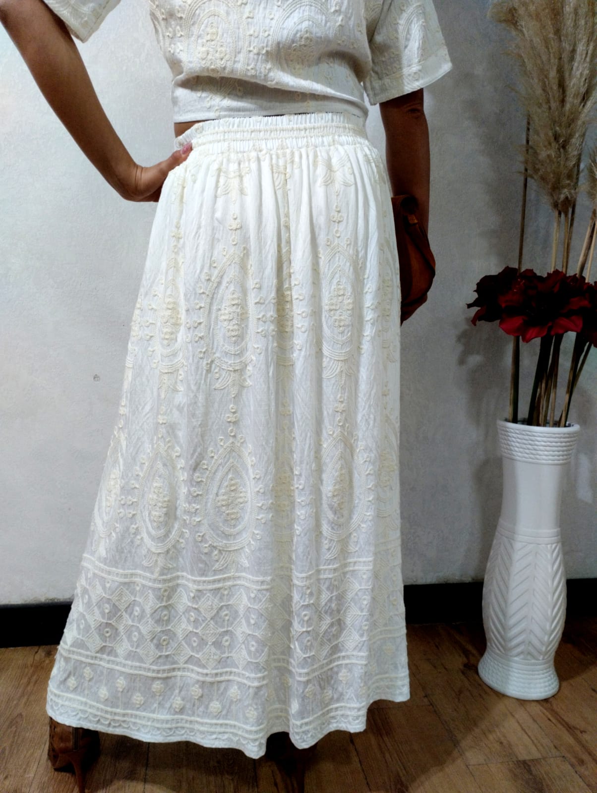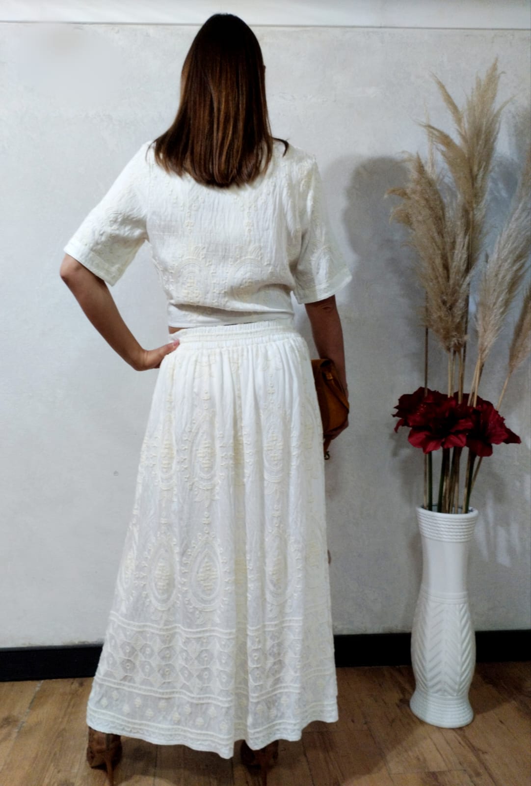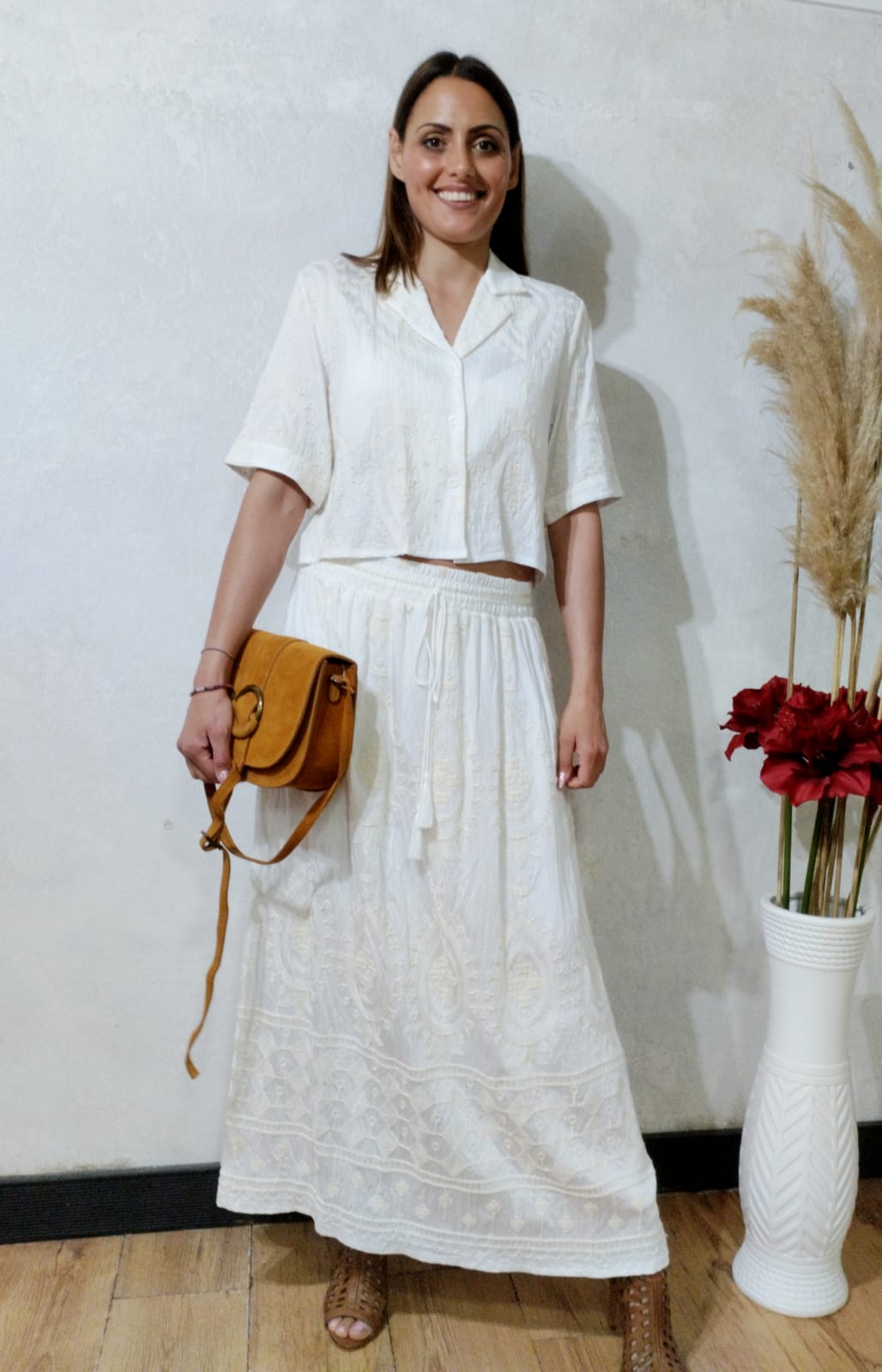 Questo completo (camicia + gonna) in cotone ricamato in stile etnico, unisce comfort grazie al tessuto naturale ed un look originale. Una scelta ideale per occasioni in cui desideri distinguerti con sobrietà e classe.