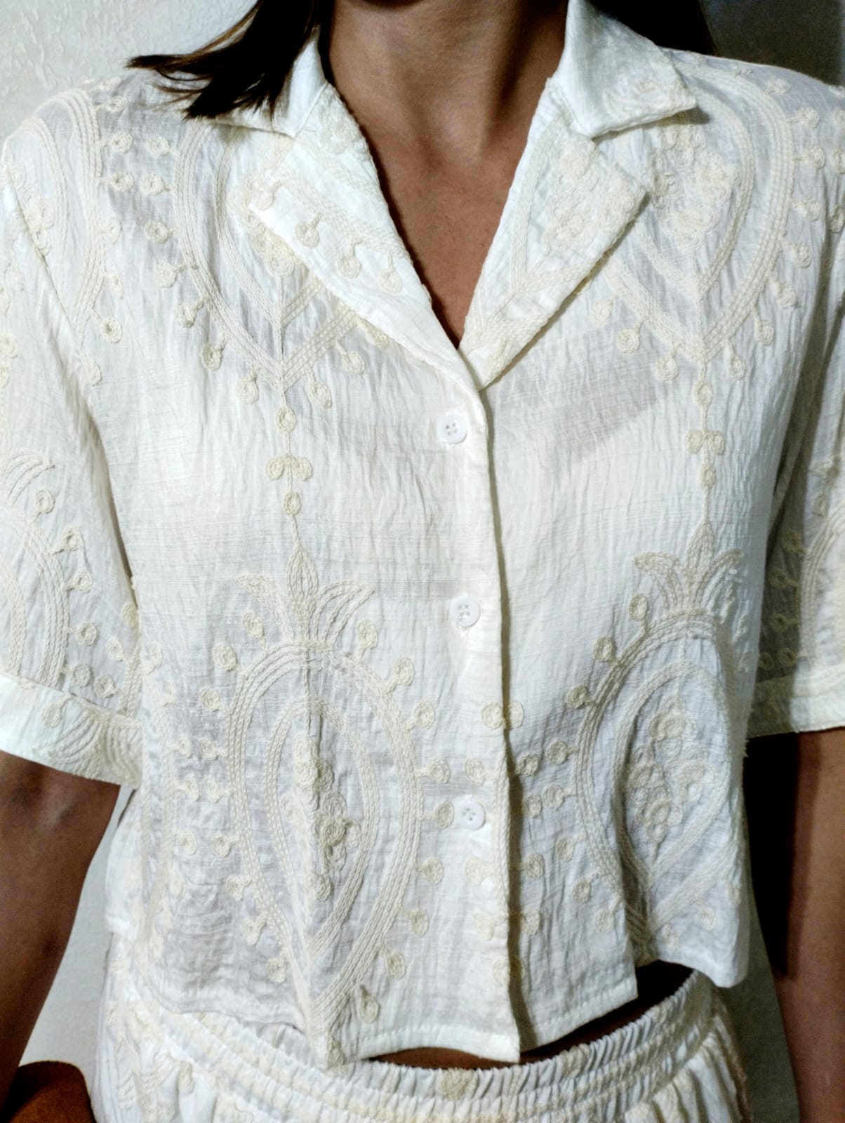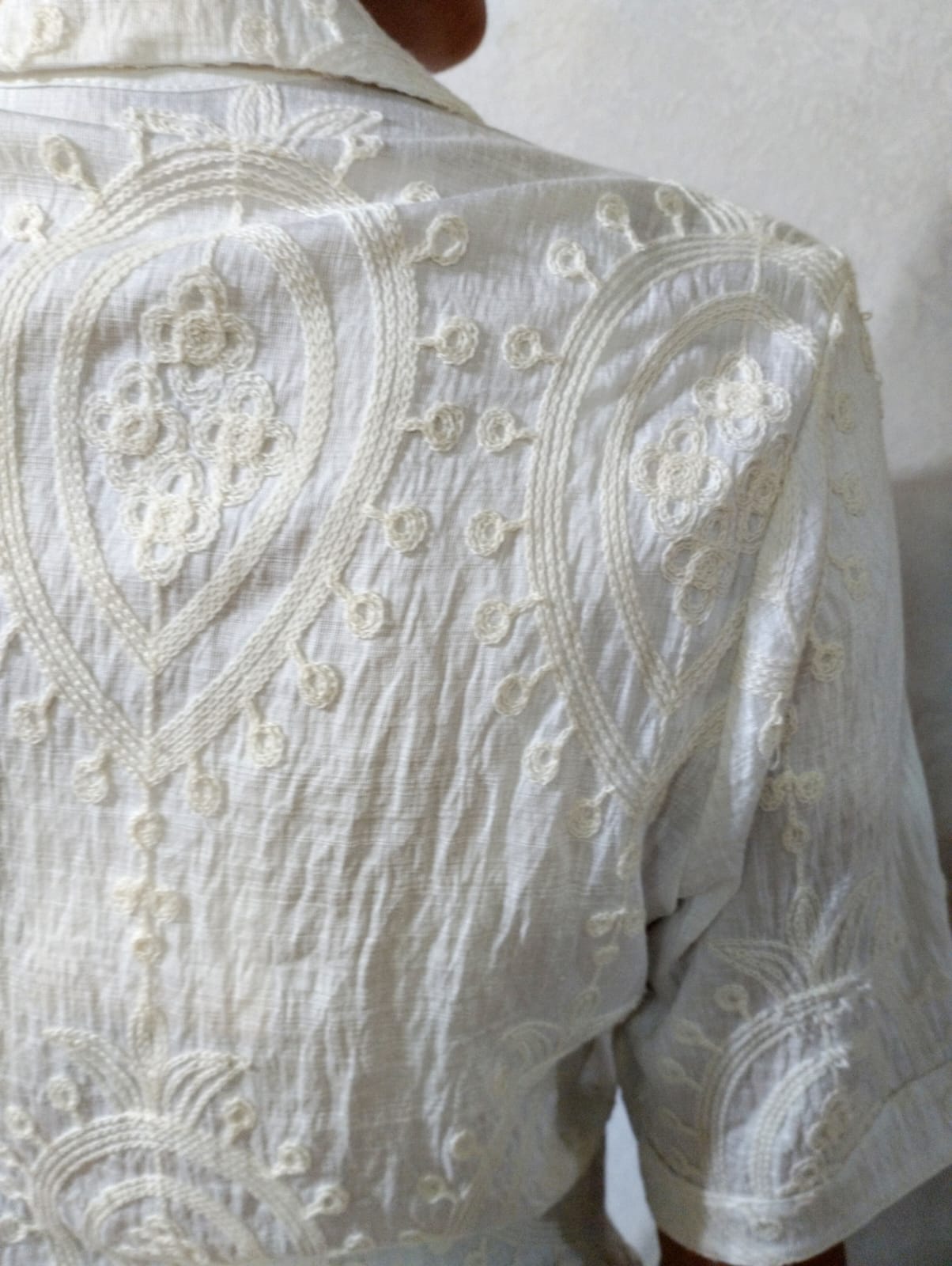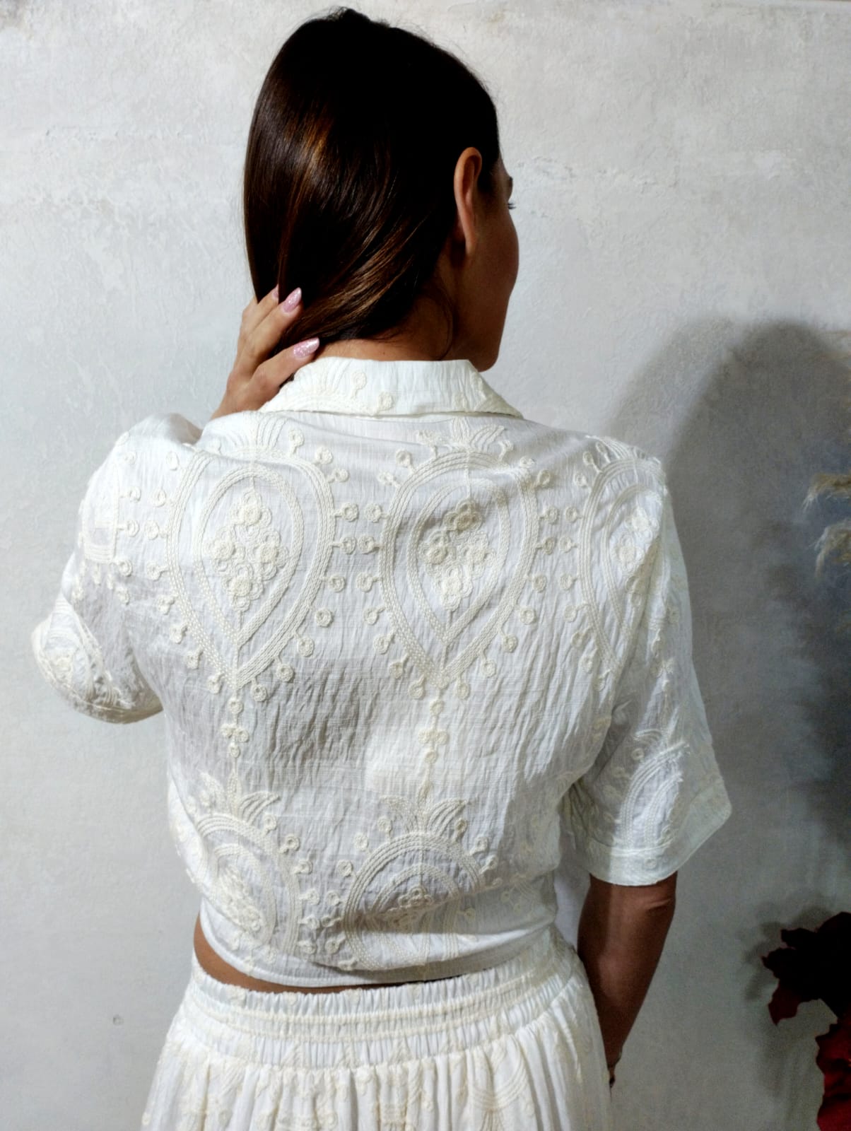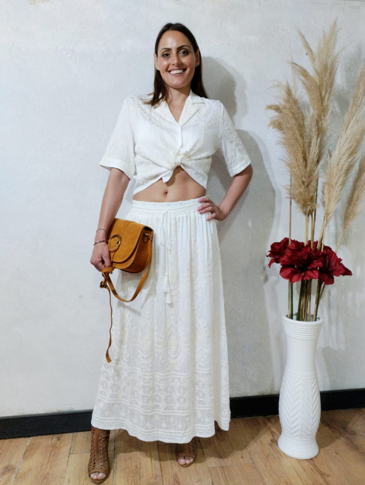 Questo completo (camicia + gonna) in cotone ricamato in stile etnico, unisce comfort grazie al tessuto naturale ed un look originale. Una scelta ideale per occasioni in cui desideri distinguerti con sobrietà e classe.