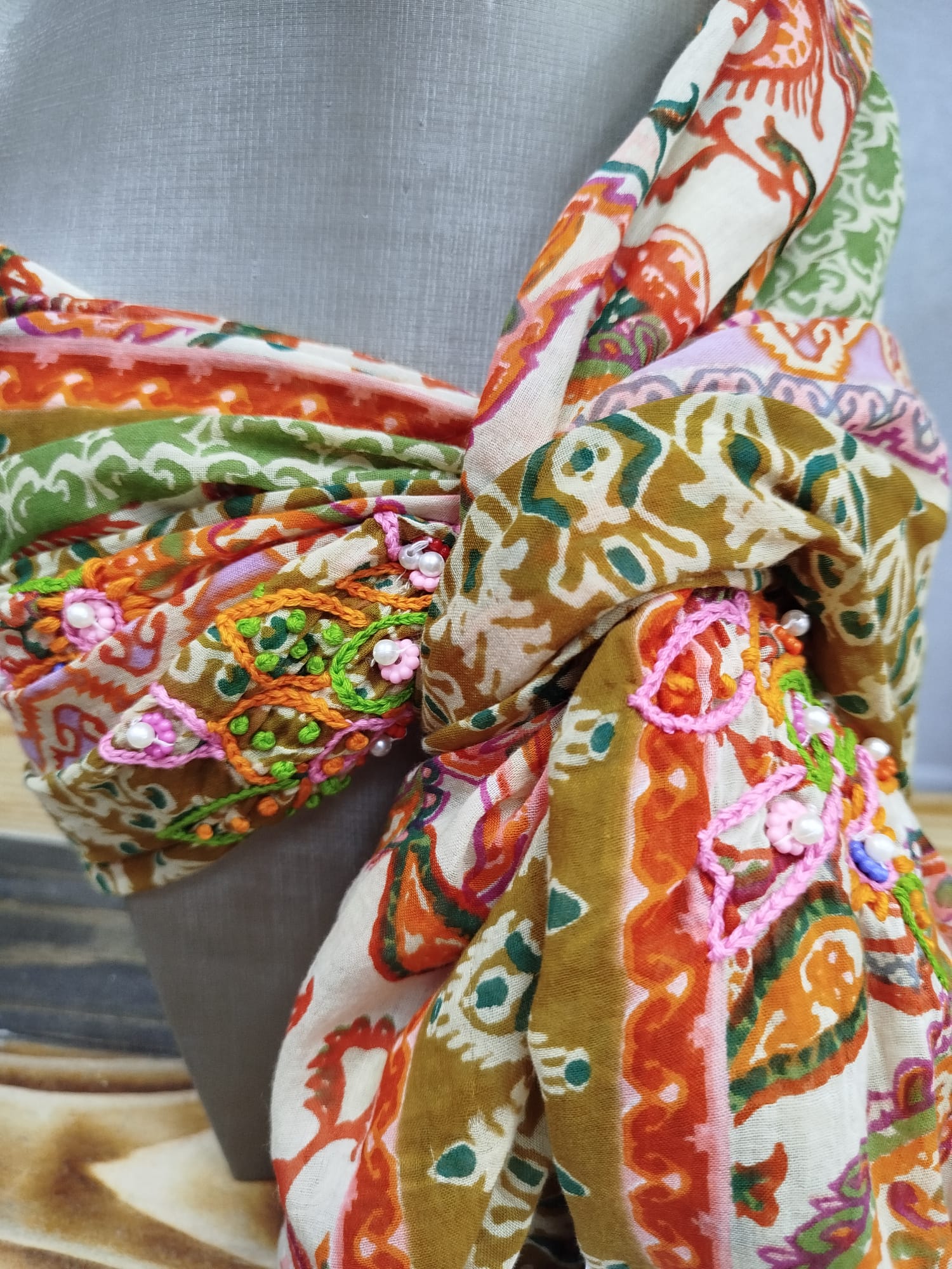 Foulard Alex-Max in cotone con fantasia cachemire, è arricchito da perline colorate e nappine. Morbido e leggero, dona comfort mentre aggiunge un tocco raffinato e originale a ogni outfit.