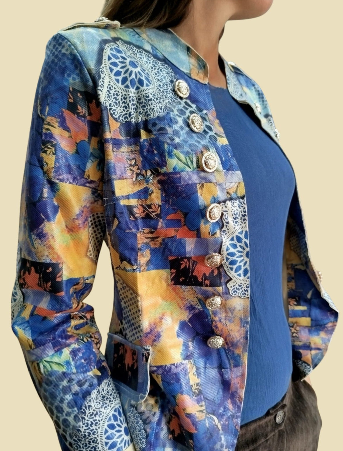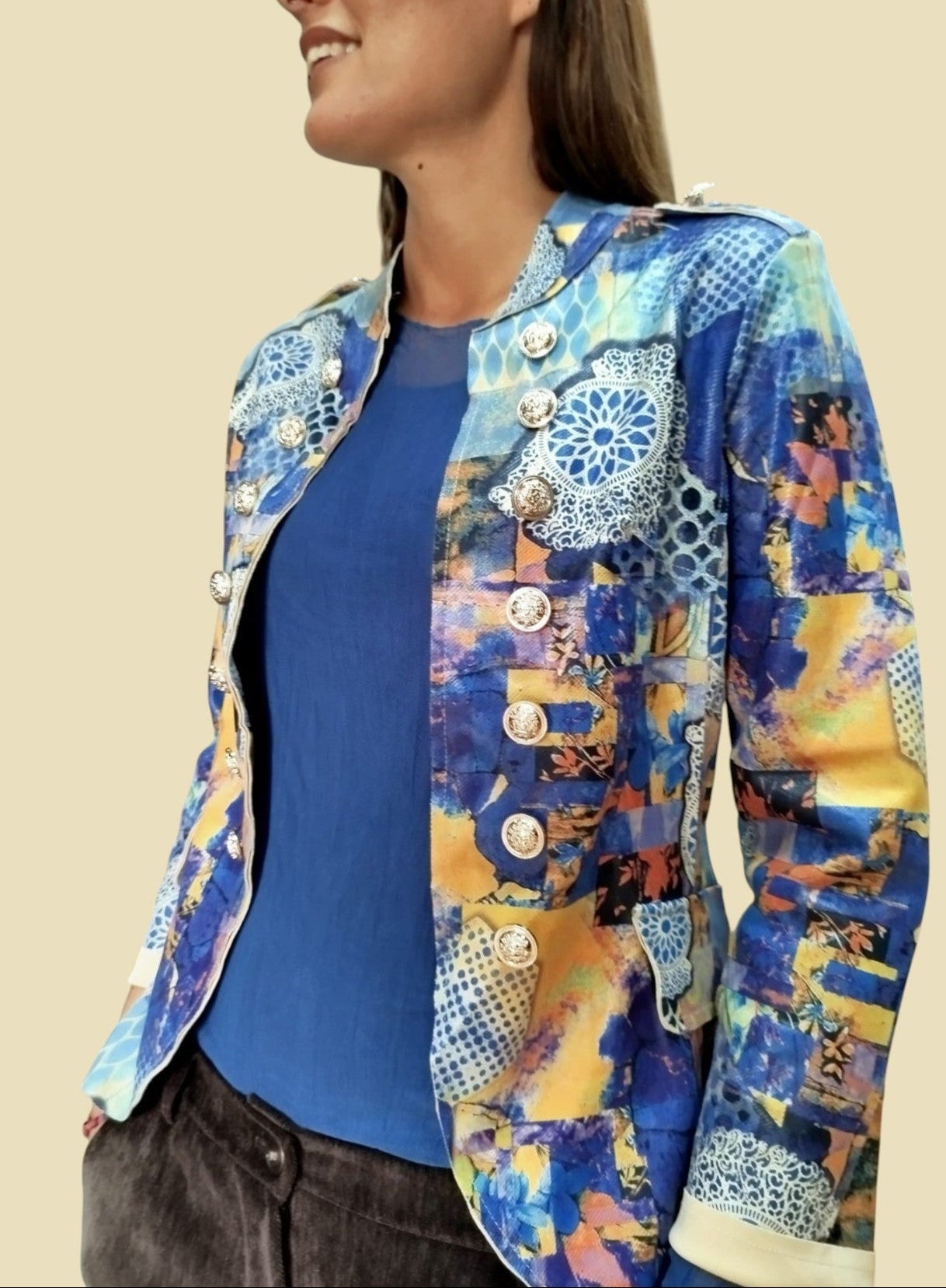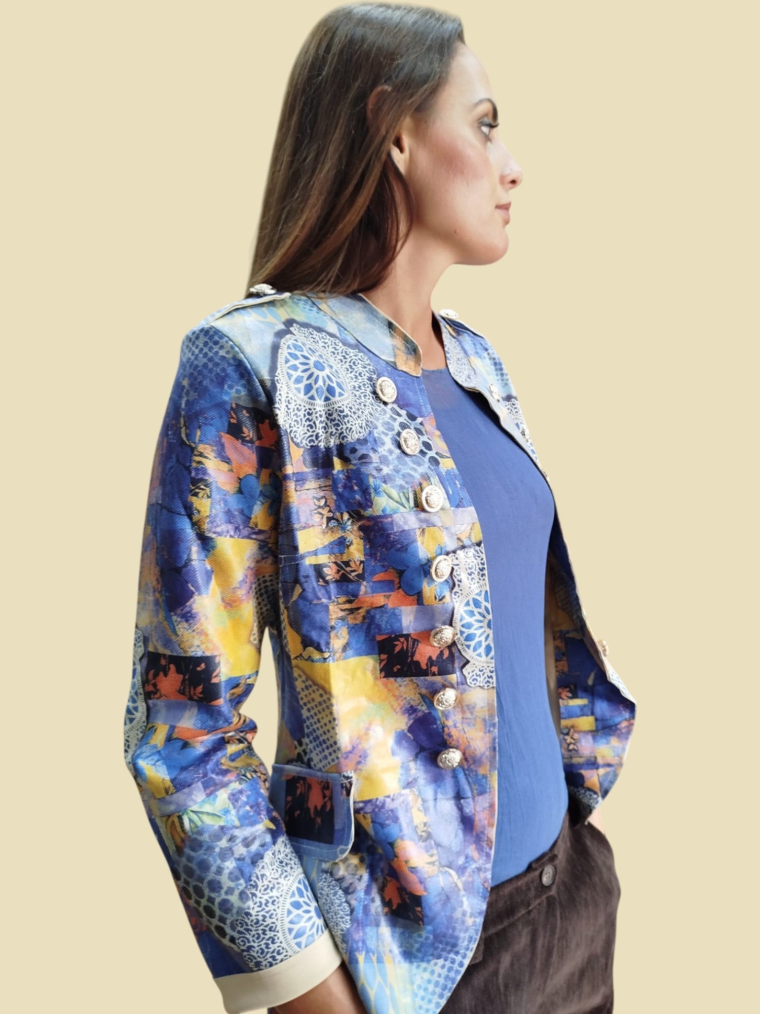 Giacca Blu fantasy con colori a contrasto, stampe originali, tessuto cerato... Lasciati conquistare dalla linea in stile ispanico, donerai al tuo outfit un tocco distintivo.