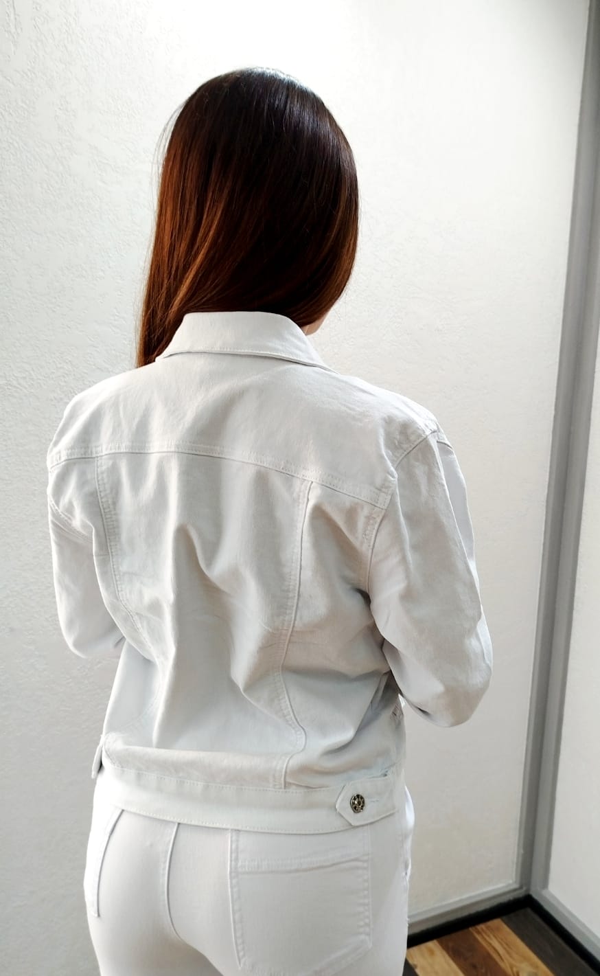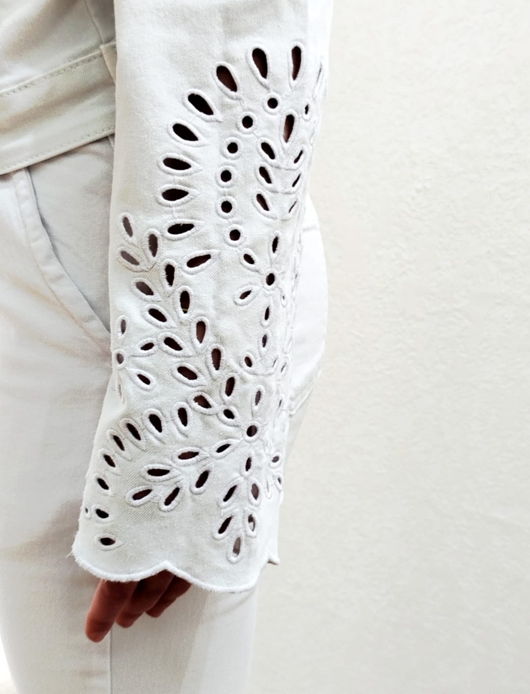 Questo giubbino bianco in jeans unisce stile e versatilità. Le maniche forate aggiungono un dettaglio particolare. Perfetto per completare qualsiasi outfit, dalla passeggiata in città alle serate casual.