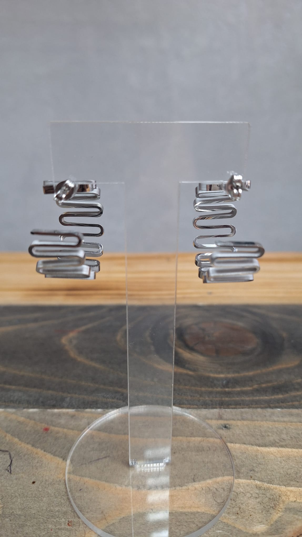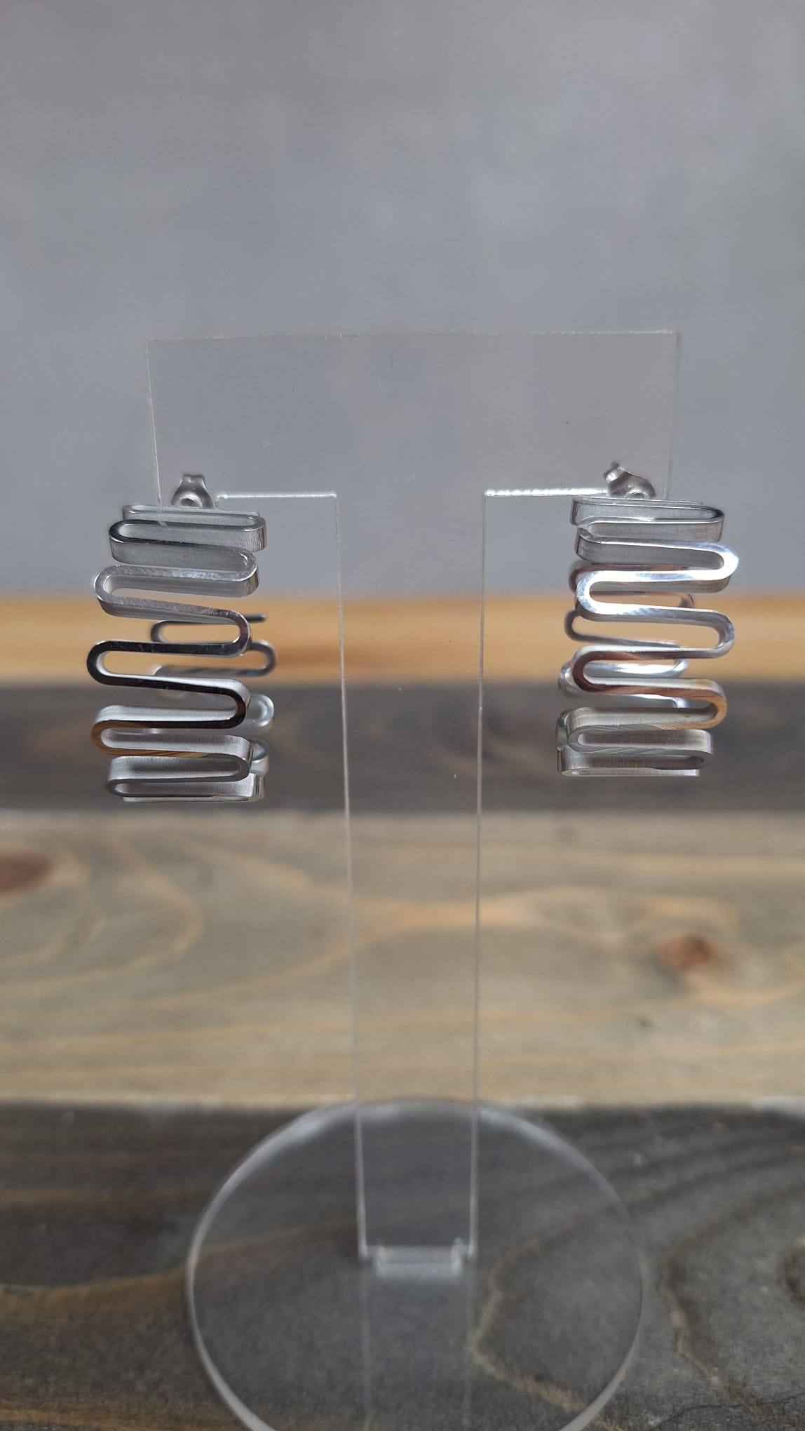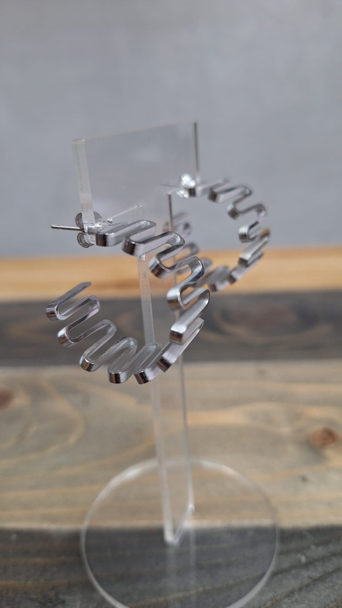 Orecchini in acciaio dal design ondulato, che uniscono modernità e eleganza in un accessorio versatile. La finitura lucida valorizza la forma fluida, creando un effetto sofisticato e contemporaneo. Perfetti per chi desidera un tocco di stile raffinato e discreto, adatto a ogni occasione.