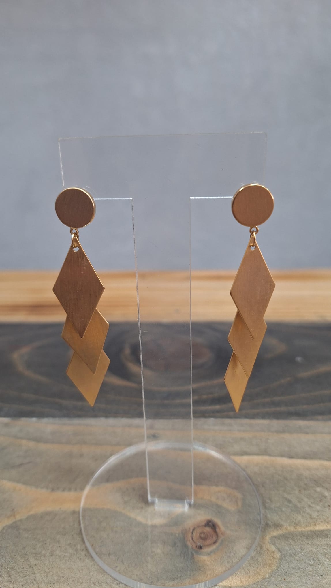 Questi orecchini rombo, rifiniti in color oro e satinati, aggiungono un tocco di raffinatezza a qualsiasi outfit. Il design geometrico moderno si sposa perfettamente con la lucentezza dell’oro, rendendoli un accessorio dallo stile originale.