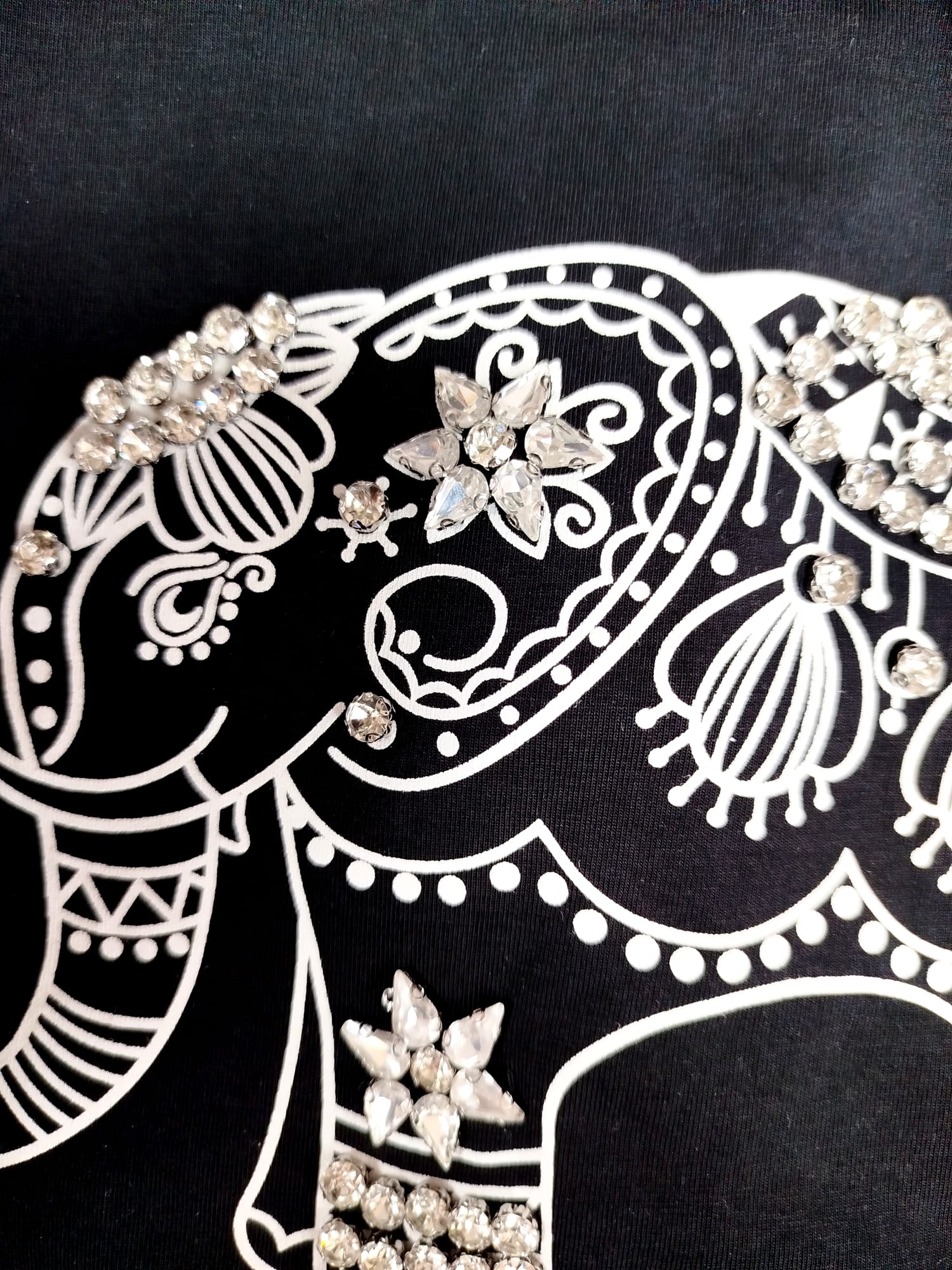 Questa T-shirt presenta un elegante disegno di elefante impreziosito da strass scintillanti che donano equilibrio tra casual e glamour. Un capo versatile che non passerà inosservato, ideale per chi desidera un look giornaliero ma originale.