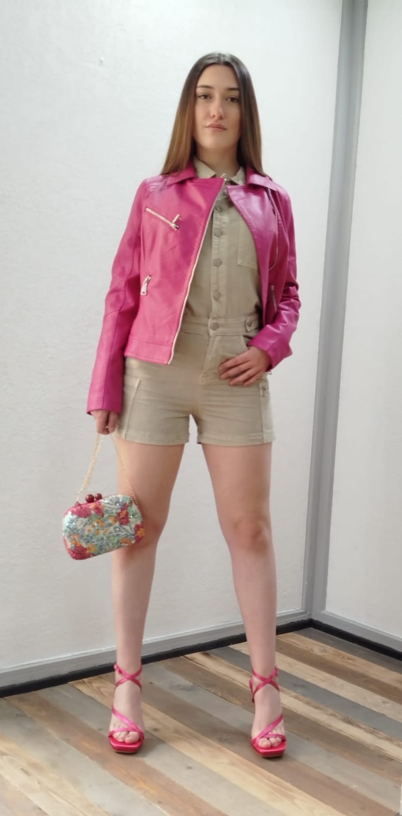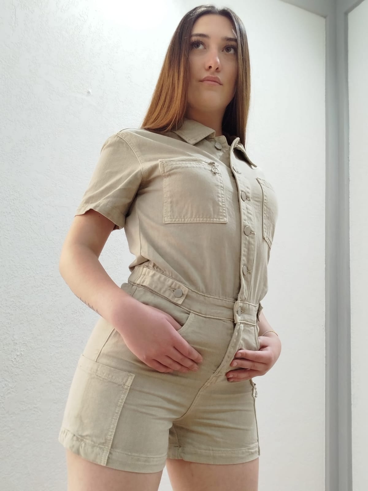 Tuta corta in jeans beige unisce stile e comfort senza rinunciare alla praticità. Il colore neutro si abbina facilmente a diverse combinazioni di outfit, perfetta per ogni occasione.
